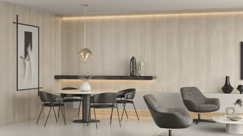 1. Madeira: A madeira continua como protagonista, agora com aparência mais natural, veios aparentes e acabamentos foscos. Tons claros e médios ganham espaço, trazendo aconchego e elegância atemporal.