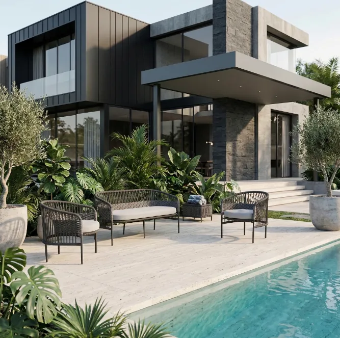 Área externa merece tanta atenção quanto o interior, e o Conjunto Leblon, nossa novidade é a prova disso! Pensado para ambientes outdoor, ele une design contemporâneo com materiais preparados para enfrentar sol, chuva e mudanças de temperatura.