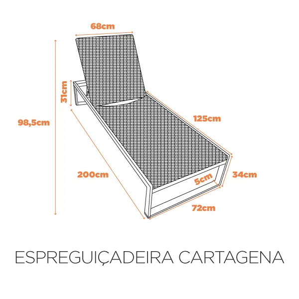 Descrição: A Espreguiçadeira Cartagena é super estilosa para usos em áreas de piscina e ambientes externos! Seu revestimento em fibra garante beleza, além de conforto para quem utiliza, ela ainda possui seu encosto regulável, podendo ficar totalmente deitada, ou no ângulo que preferir ! Além de ter a resistência de seu acabamento em alumínio!